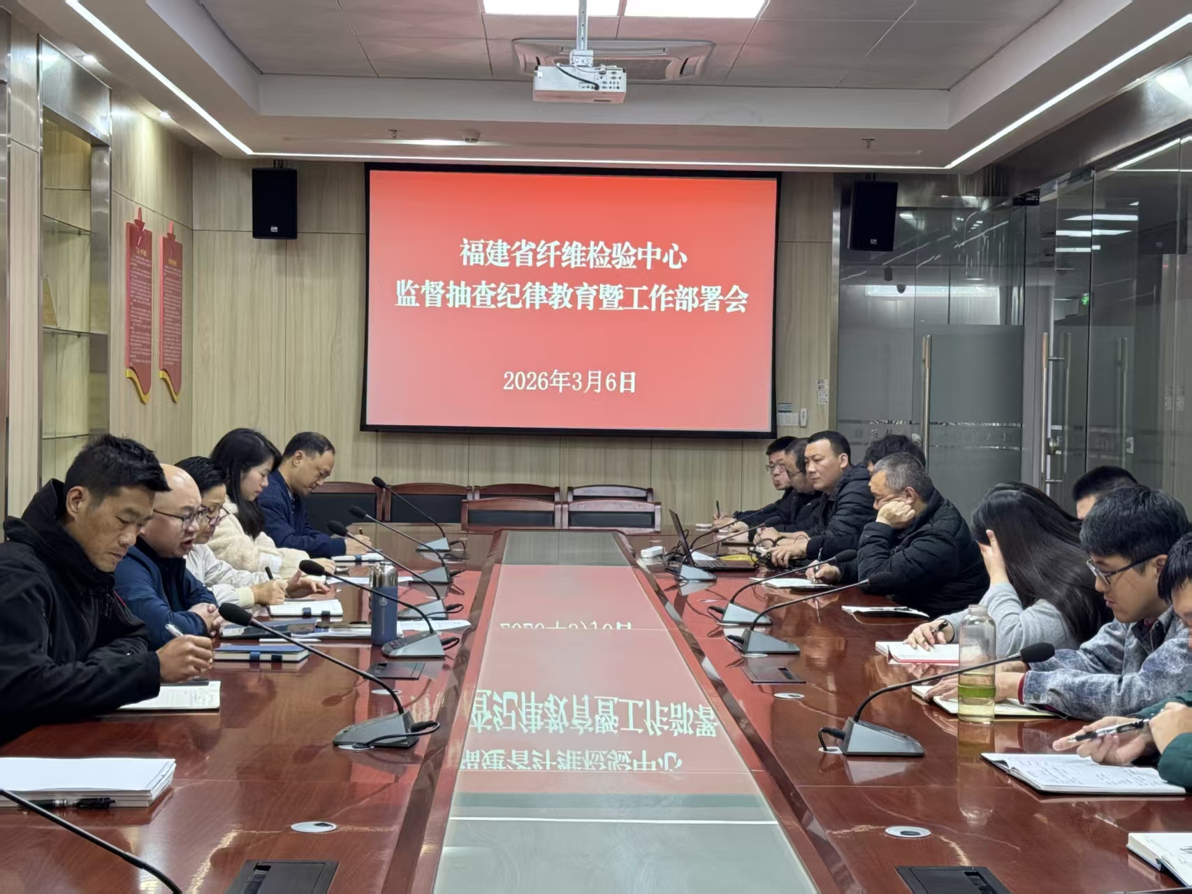 3月6日,为进一步严明抽查纪律、筑牢廉洁防线,规范抽样流程,保障2026年抽查工作规范高效开展,福建省纤检中心召开监督抽查纪律教育暨工作部署会,中心党委副书记、纪委书记滕牧出席并讲话,纪检部门及全体抽样人员参会。